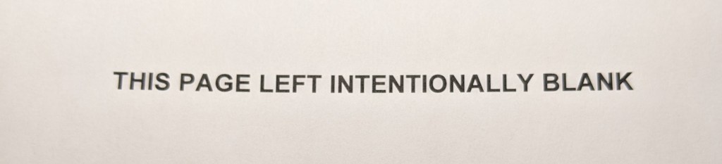 ‘This page left intentionally blank’ is my favourite nonsensical and paradoxical bureaucratic phrase. There’s something of the Zen koan in it, like ‘what is the sound of one hand clapping?’ Needless to say, the point of the blog is not to leave pages blank, intentionally or otherwise.